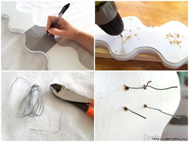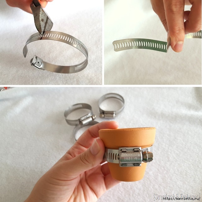 Горшочки будут висеть на полочке при помощи металлических хомутов. Для хомутов сверлим отверстия и вставляем проволоку