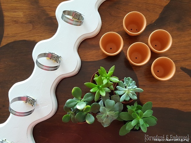 В данном варианте использована деревянная доска - 23 на 5 дюймов для 5-ти горшочков. С размерами доски и количеством горшочков вы можете определиться сами.